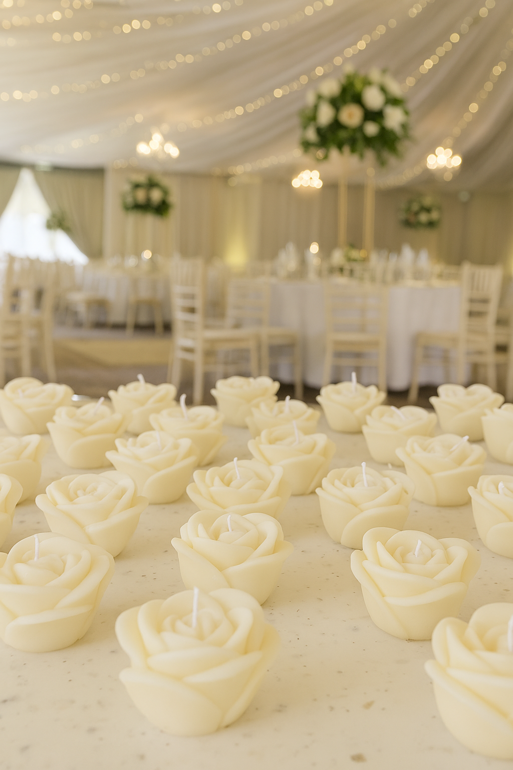 Ένα πολυτελές κερί σε σχήμα τριαντάφυλλου, σχεδιασμένο να αναδεικνύει την κομψότητα και τη φινέτσα κάθε γάμου. Με την αίσθηση της καθαρότητας και την αισθητική του λουλουδιού της αγάπης, μετατρέπει κάθε στιγμή σε μια αξέχαστη εμπειρία γεμάτη ρομαντισμό και πολυτέλεια.