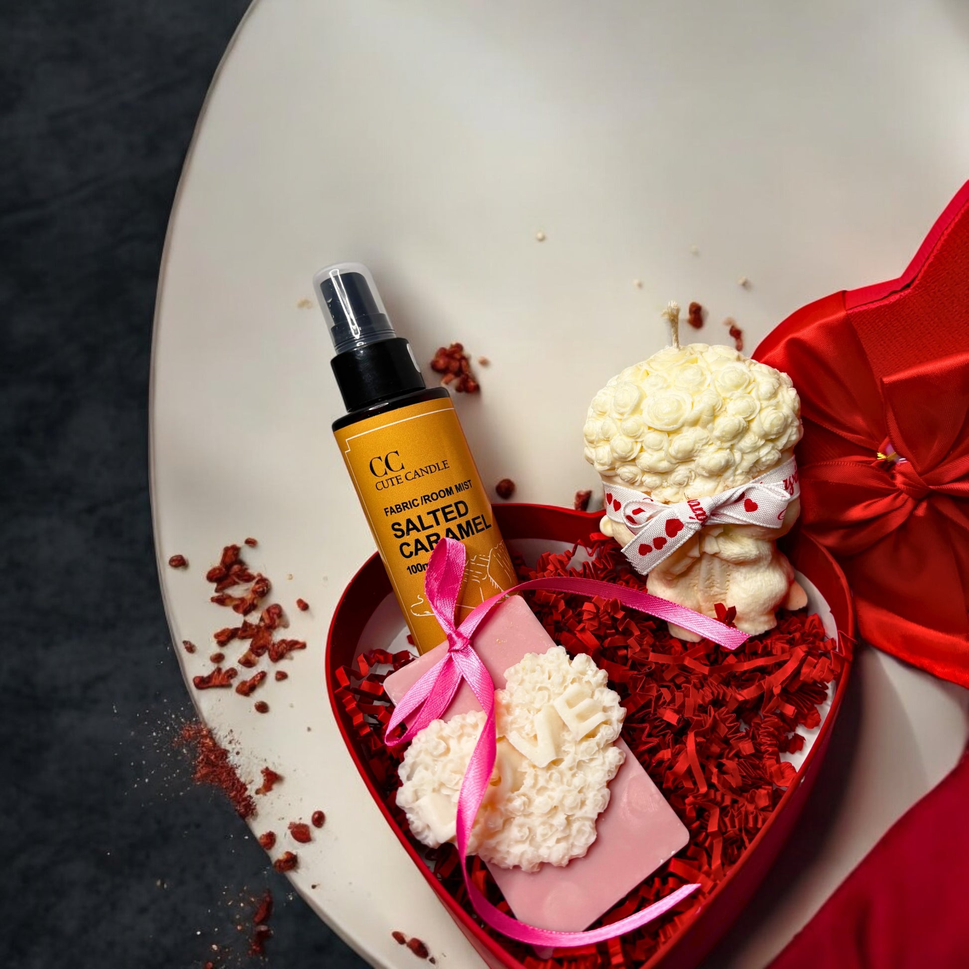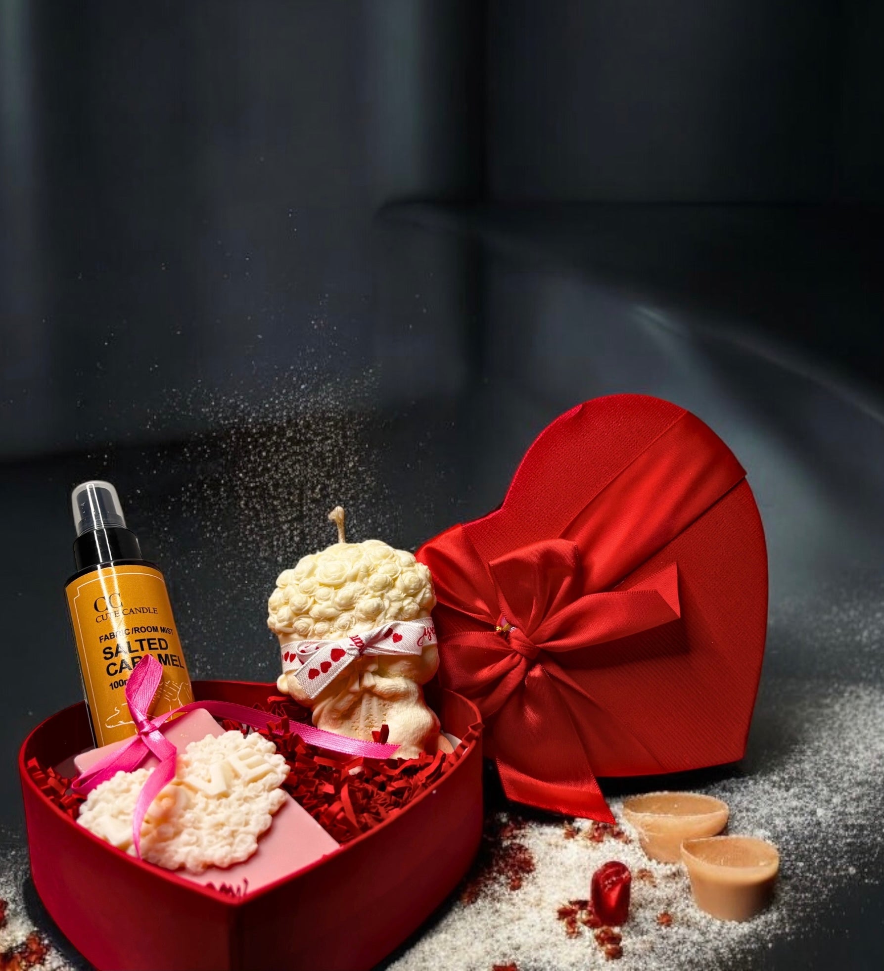Παρουσιάζεται σε ένα κομψό, κόκκινο, καρδιάς-σχήματος κουτί και περιλαμβάνει ένα αρωματικό αρκουδάκι από κερί, ένα wax cookie και ένα spray με άρωμα Salted Caramel.