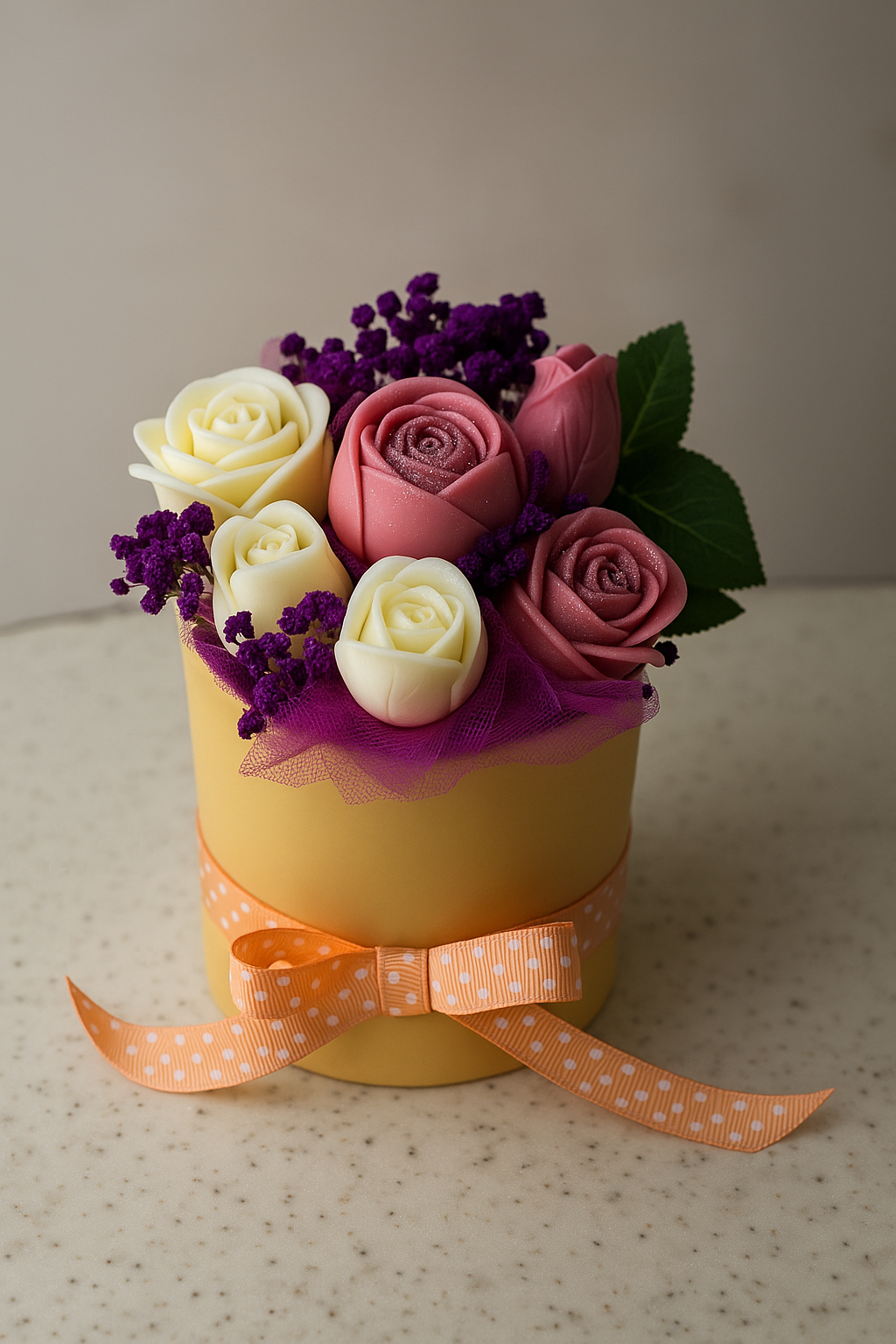 Ένα ευδιάθετο, χειροποίητο μπουκέτο λουλουδιών από κερί σε στρογγυλό κουτί, εμπνευσμένο από τις φωτεινές στιγμές της ημέρας. Με ροζ και ιβουάρ τριαντάφυλλα, μοβ αποχρώσεις και άρωμα γιασεμιού, νυχτολούλουδου και πούδρας, γεμίζει τον χώρο με φρεσκάδα και κομψότητα.