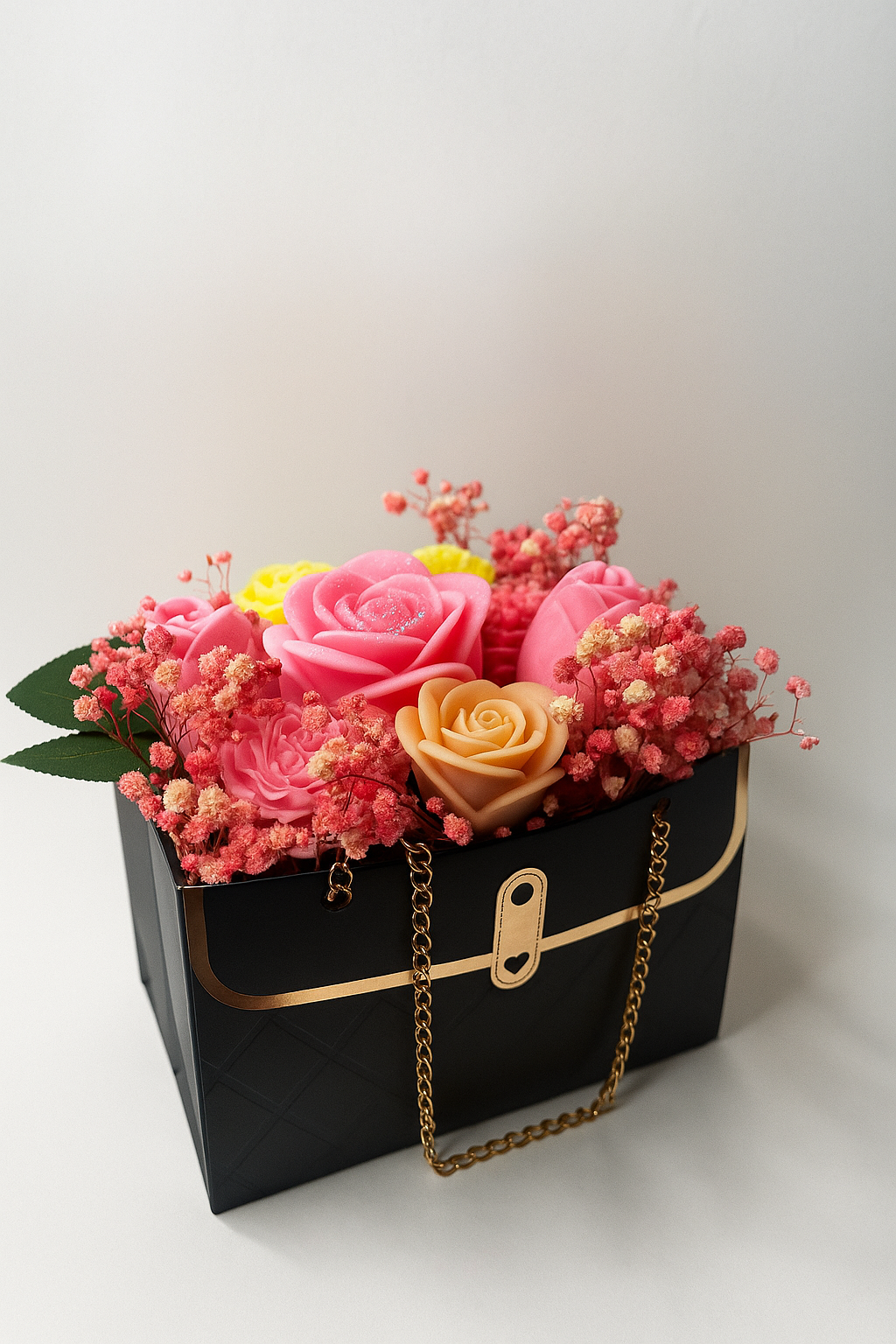 Ένα μοναδικό τσαντάκι-μπουκέτο με έντονη προσωπικότητα. Μαύρη πολυτελής βάση, χρυσή λεπτομέρεια και δυναμικοί ροζ/σομόν τόνοι συνθέτουν ένα statement δώρο με άρωμα γιασεμιού, νυχτολούλουδου και πούδρας.