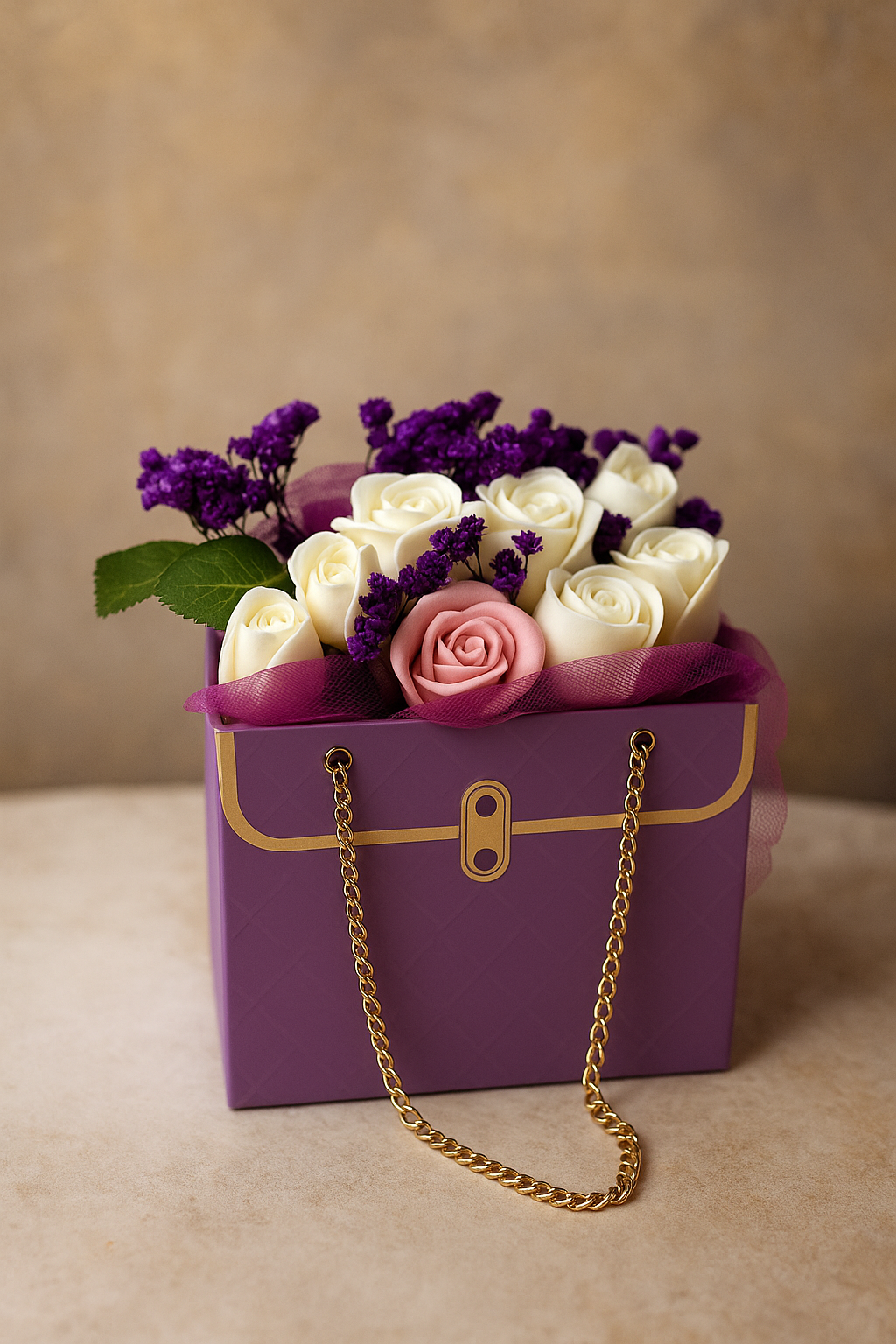 Ένα μοναδικό τσαντάκι-μπουκέτο εμπνευσμένο από τις αποχρώσεις της λεβάντας και της νύχτας. Οι λευκές τουλίπες από κερί συνδυάζονται με αποξηραμένα μοβ άνθη και μια ροζ πινελιά που σπάει την αυστηρότητα.