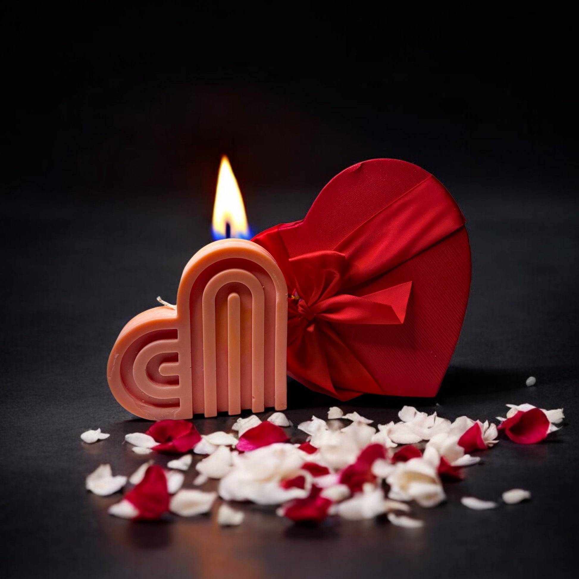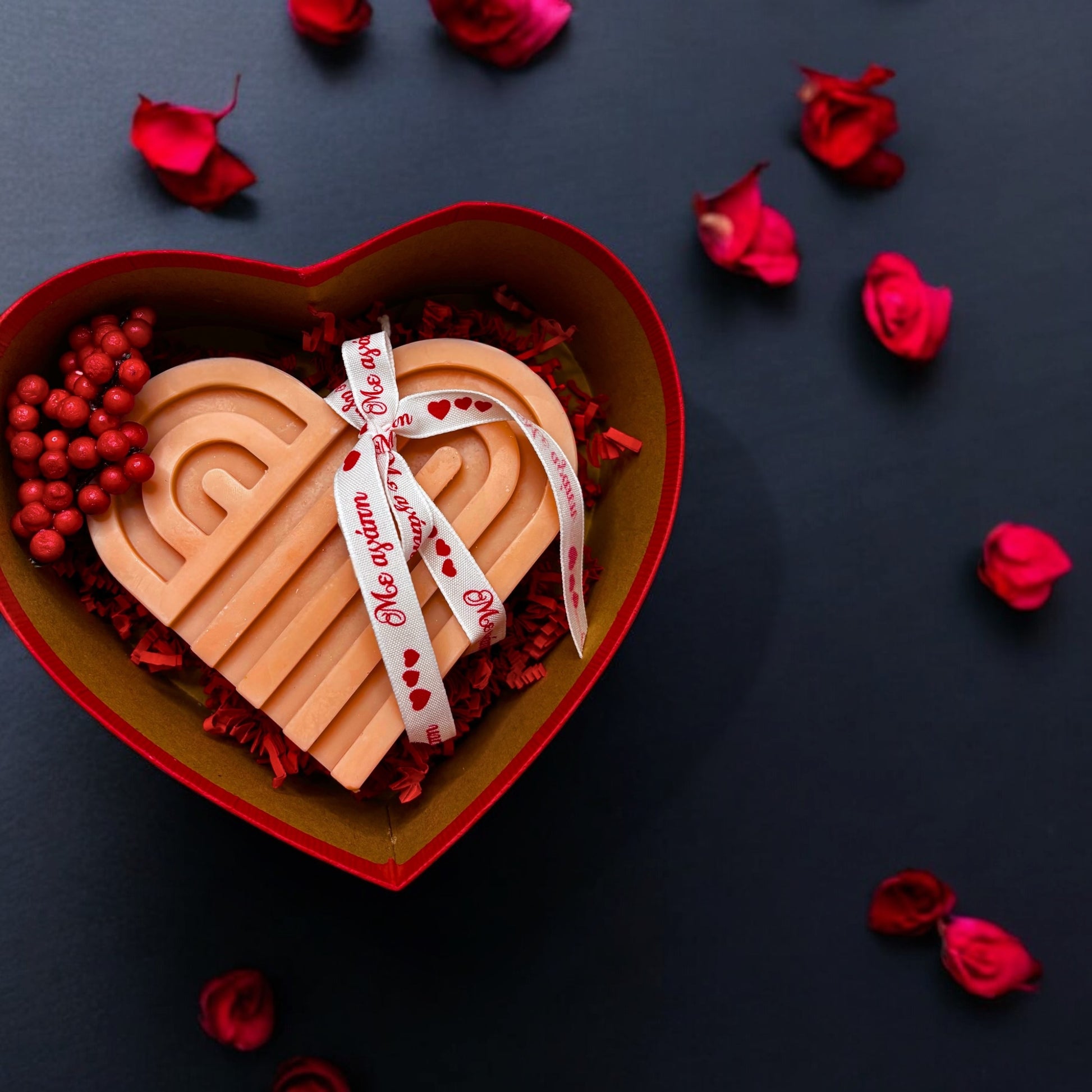 Η πλούσια κόκκινη βελούδινη καρδιά, διακοσμημένη με κομψή κορδέλα και αρωματικά κεριά, δημιουργεί μια ατμόσφαιρα ρομαντισμού και εκλεπτυσμένης κομψότητας.