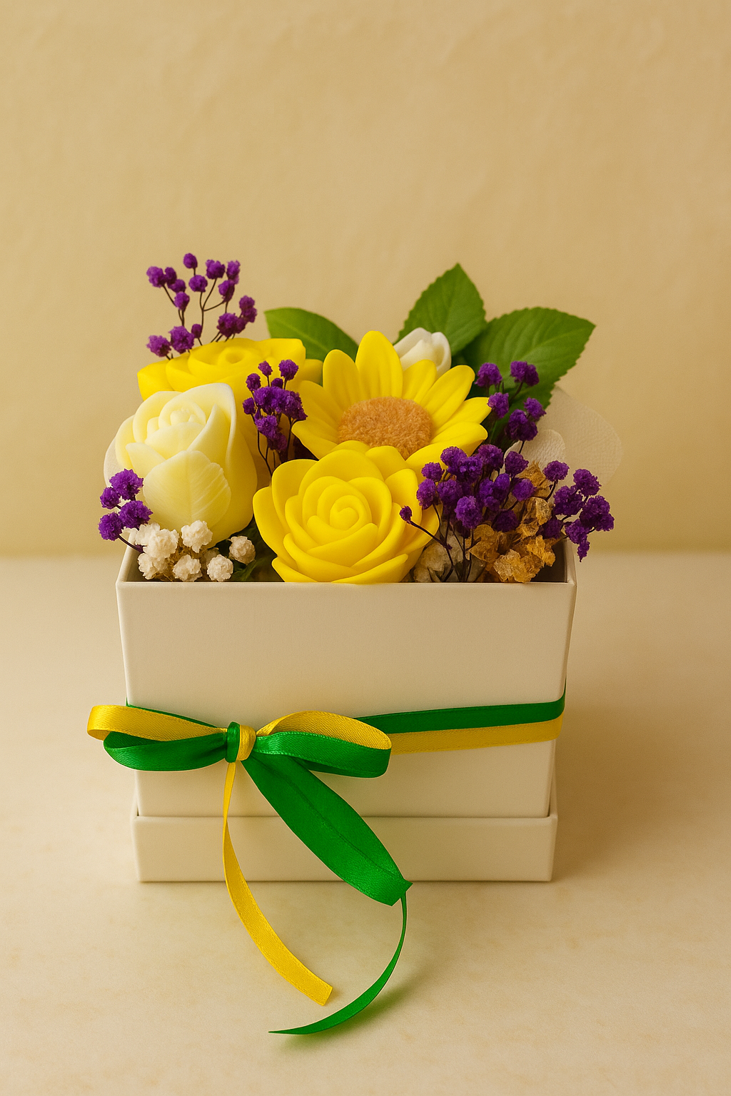 Ένα εκρηκτικό, εξωτικό μπουκέτο που ακτινοβολεί ενέργεια και ζωντάνια! Ηλιοτρόπια, τριαντάφυλλα και ρομαντικά άνθη σε έντονο κίτρινο και λιλά, δεμένα σε λευκό κουτί με tropical-inspired κορδέλα.